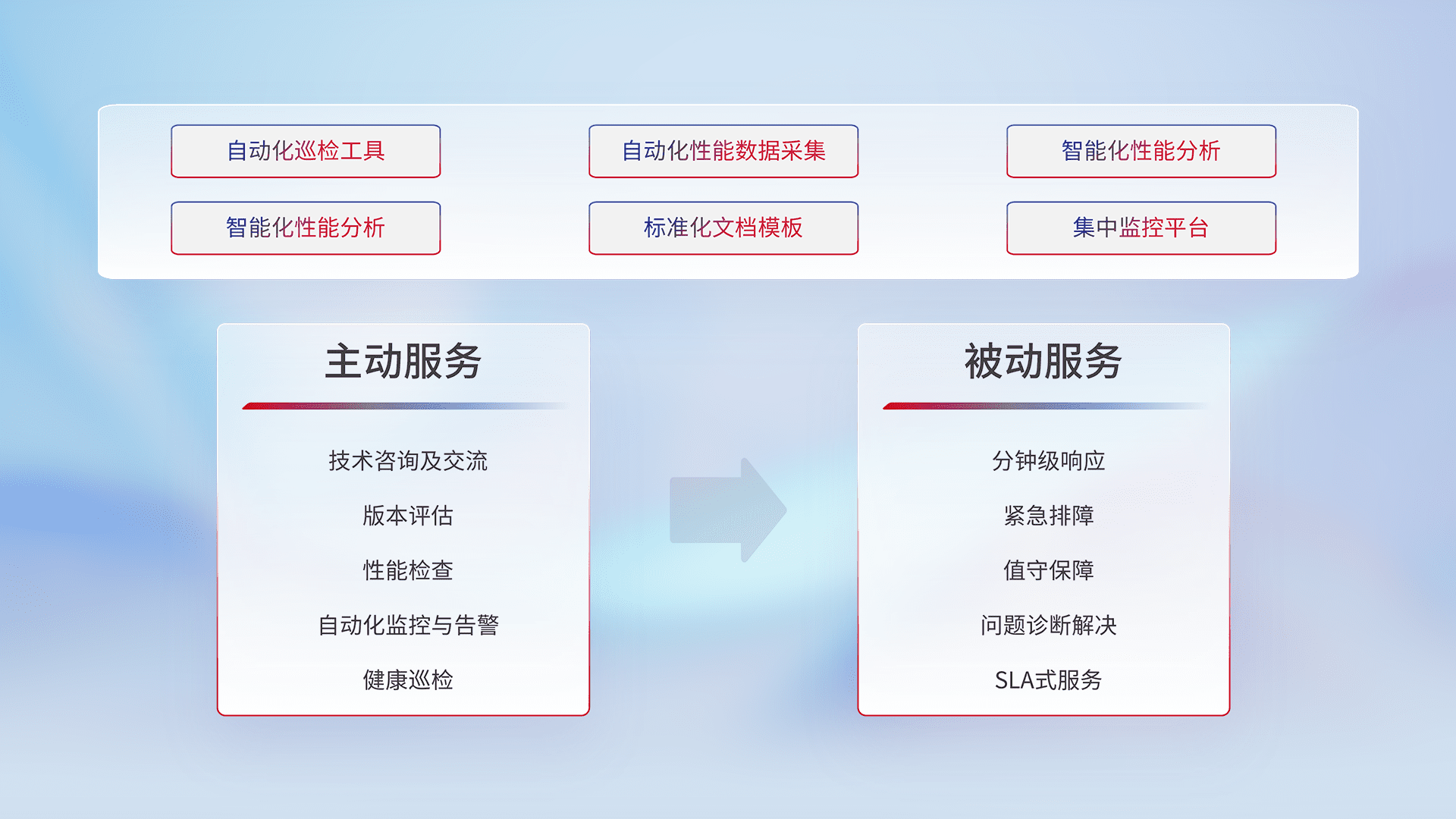 智能化工具和标准化文档,,保障服务质量,,,提供主动服务(包含技术咨询、、、、版本评估、、性能检查、、、、自动化监控与告警、、、健康巡检)和被动服务包含(分钟级响应、、、紧急排障、、、值守保障、、、、问题诊断解决、、SLA服务)。。。